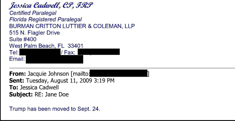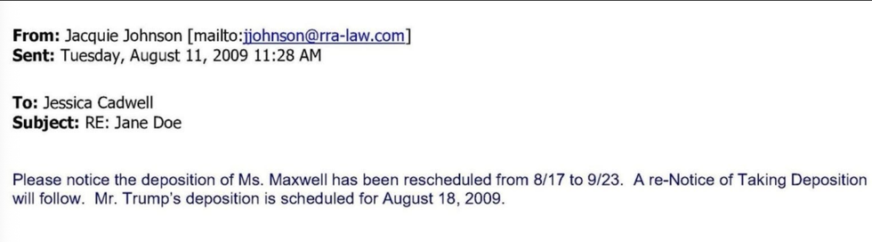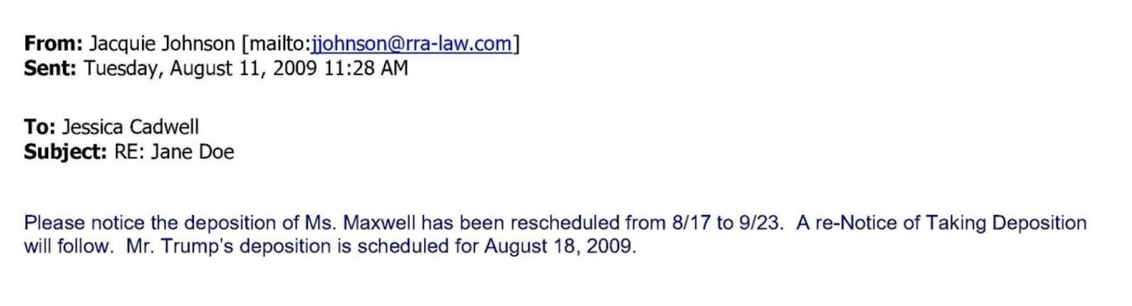 In his book, Edwards isn’t specific about the Trump chat – he just says “summer of 2009.” But the emails indicate Trump was scheduled to be deposed in late August, then moved to late September. The paralegals had him on the same deposition list as Ghislaine Maxwell, who was also busy dodging them.