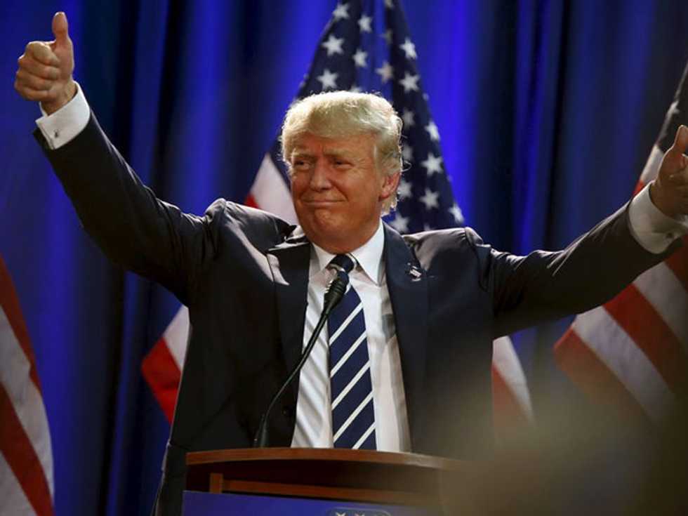 Photo: Republican presidential hopeful Donald Trump gives the keynote speech at the Republican Party Lincoln Day event in Birch Run, Michigan, August 11, 2015. (REUTERS/Rebecca Cook)