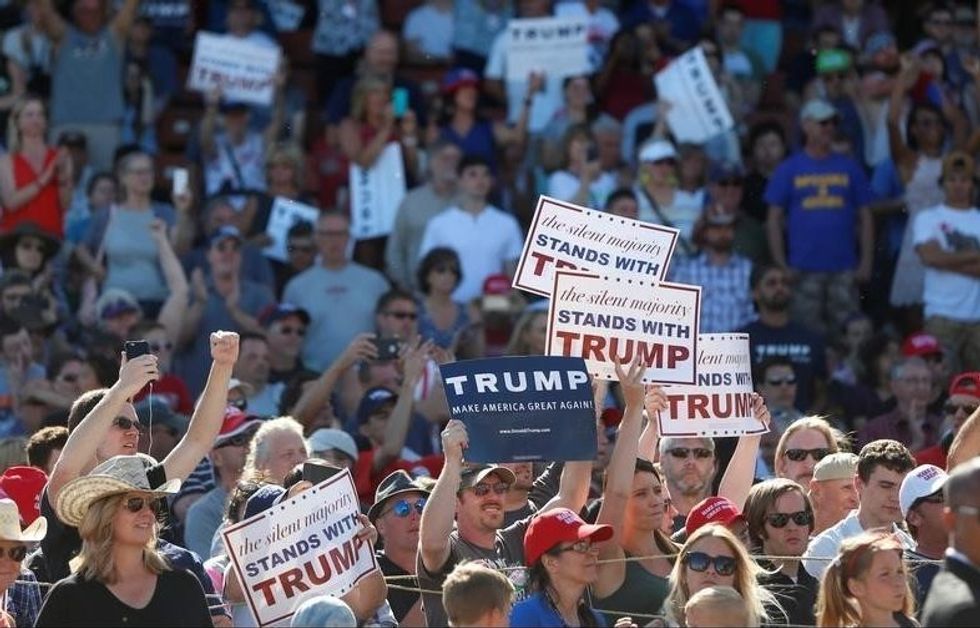 Photo: Supporters hold signs as Republican U.S. presidential candidate Donald Trump speaks during a campaign rally in Lynden, Washington, U.S., May 7, 2016. REUTERS/Jim Urquhart