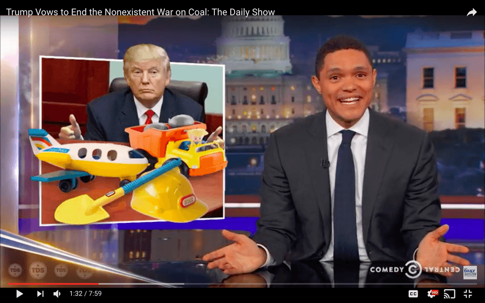As the leader of the free world dons a hardhat and mimes shoveling coal, Trevor Noah confesses: “President Trump may destroy the world, but goddam he’s cute. You can’t deny that.” Watching him on tape, the Daily Show host suddenly understands: “All Trump ever wanted to do was play president. We should have just given him a Fisher-Price president set. He would have had so much fun!”