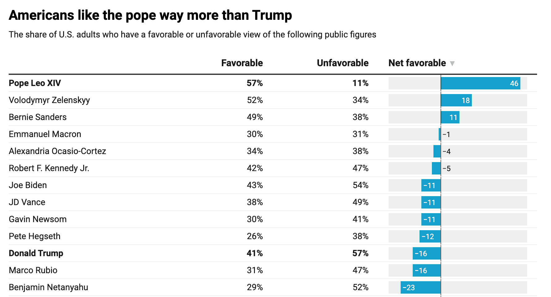Unlike Trump, whose approval rating has declined by double digits since being sworn in last year, the pope is popular. In a Gallup poll conducted last July, Pope Leo XIV had a 57 percent favorability rating and was the most popular of the 14 newsmakers surveyed. In that same poll, Trump had a 41 percent favorability rating.