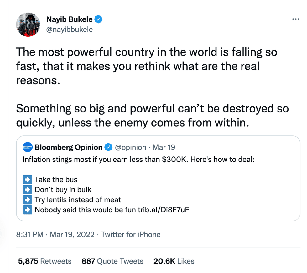Bukele’s tweet was his response to a Bloomberg op-ed titled “Inflation Stings Most If You Earn Less Than $300K. Here's How to Deal.”