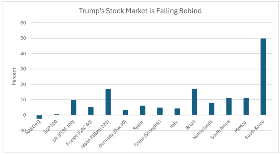 Compare that to 4.2 percent gain someone would have had in the Italian stock market since the start of the year, the 5.3 percent gain in the French market, or the 9.9 percent gain in the U.K. If investors wanted to go to a bit more exotic realms they would have gotten an 11.1 percent gain in Mexico, a 16.9 percent return in Japan, and a 17.2 percent return in Brazil. And then there is the grand prize winner for the first two months of 2026, South Korea with a 49.7 percent return.