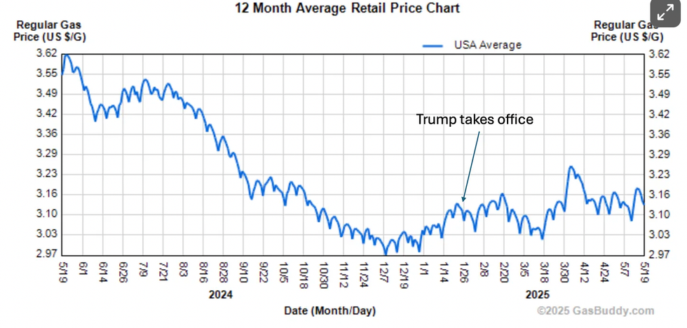 Now, in general presidents deserve neither credit nor blame for fluctuations in gasoline prices, which mainly reflect the global price of crude oil. But that aside, what the heck is Bessent talking about? Here’s what has been happening to gas prices: