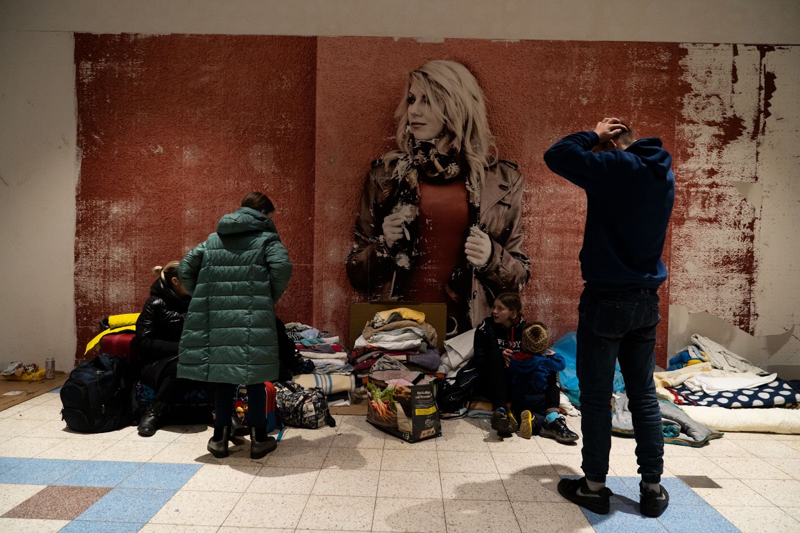 People line the walls. Sitting or reclining. Sleeping. Crying. Playing with their mobile phones. Every inch is occupied. To my left and right are stores that once offered jewelry, dresses and sofas, now all gone, replaced by hundreds of Ukrainian people crammed into this noisy makeshift dormitory.