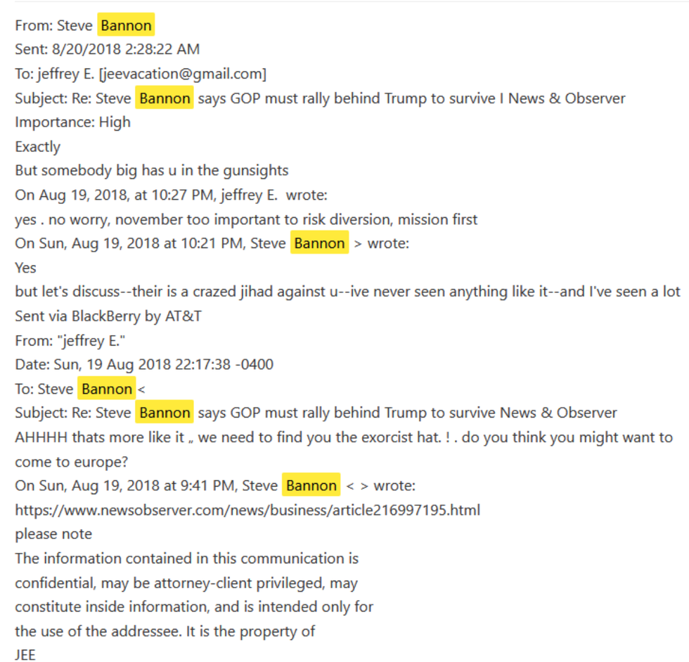 In August 2018, Epstein asked Bannon if he wants to “come to Europe," and Bannon replied: “Yes. But let’s discuss–their is a crazed jihad against u–i’ve never seen anything like it–and I’ve seen a lot."