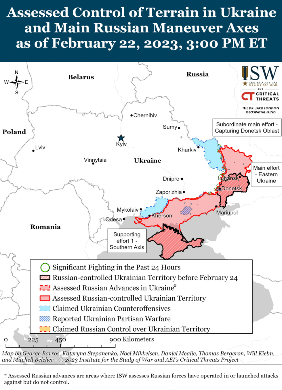 There have been lots of headlines this week as we approach the anniversary of Russia’s invasion of Ukraine. Most of them have focused on the 600-mile front line that runs from the Russian border near Kupyansk in Ukraine’s north to Kherson in the south. Last September, a Ukrainian offensive took a 3,000 square mile area in the Kharkiv region, including the strategic towns of Izyum and Lyman, where Russia had established its army operations headquarters and resupply depots. In November, Russia pulled its forces out of the port town of Kherson in the south. The front line has been static since then, with Russia claiming it has taken the town of Bakhmut in the north and Ukraine countering that its troops still hold the city.