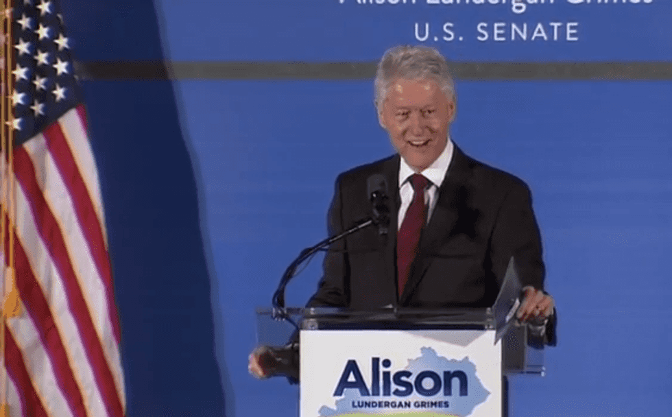 Former president Bill Clinton hit the campaign trail on Tuesday, urging Kentucky voters to send Alison Lundergan Grimes to the U.S. Senate.