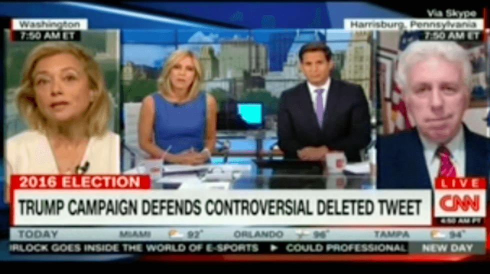Jeffrey Lord made an appearance on CNN’s New Day on Tuesday to… what else? Defend Donald Trump’s latest outrageous outburst. This time, it was one of Trump’s tweets, sent on Saturday morning, boasting about Hillary Clinton’s alleged corruption while placing the presumptive Democratic nominee’s face next to a star of David, against a backdrop of piles of money.