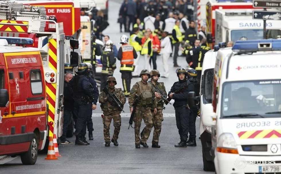 Photo: French riot police (CRS), soldiers, firefighters, French red cross members and staff of the emergency medical services in France (SAMU) stand at the scene in Saint-Denis, France, near Paris, November 18, 2015 during an operation to catch fugitives from Friday night’s deadly attacks in the French capital. REUTERS/Benoit Tessier