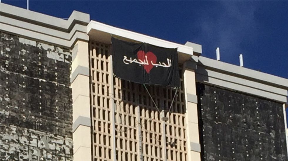 Just yesterday, Lubbock’s mayor called local and federal investigators to investigate a large banner in Arabic that was found hung on the side of its unfinished city hall. Though the sign translated to “love for everyone,” Mayor Glen Robertson, in a letter to City Manager James Loomis, demanded the state investigate the sinister banner: