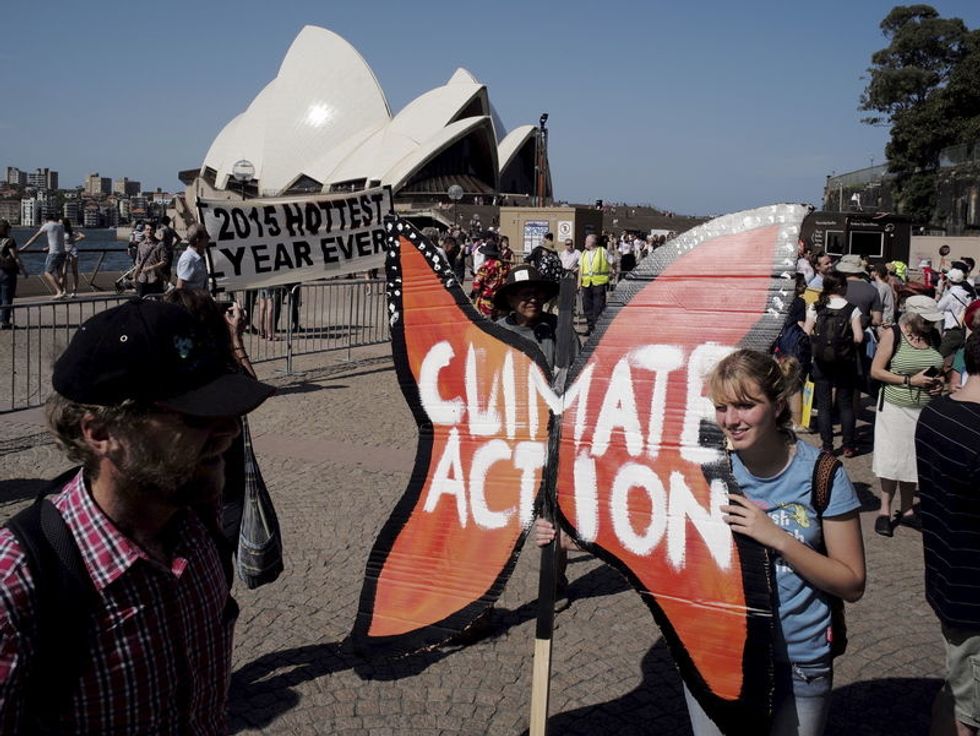 Protester Amy Walburn holds a butterfly-shaped placard in front of the Sydney Opera House during a rally held ahead of the 2015 Paris Climate Change Conference, known as the COP21 summit, in Sydney’s central business district, Australia November 29, 2015. REUTERS/Jason Reed